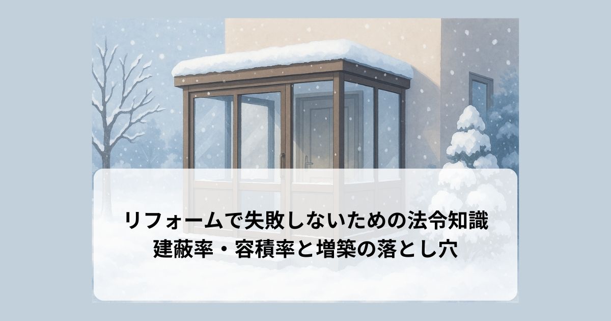 雪や寒さ対策として、玄関先や勝手口に風除室(ふうじょしつ)を増築するケースは北海道で非常に多いリフォームです。しかし、この風除室の設置には、法令上の注意が必要です。
